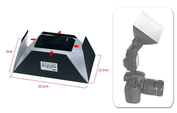 1. Rámeček nasadíme na systémový blesk tak že omotáme proužek suchého zipu kolem hlavy tak aby rámeček byl připevněn na přední straně blesku směřující dopředu.