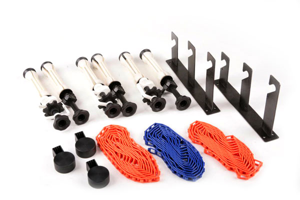 Držáky pro uchycení 3 rolí foto-pozadí na zeď nebo na strop +3x sada rozpínacích trnů pro papírové/hliníkové role pozadí s řetízky a závažím. Plastový řetěz se dá jednoduše zkracovat podle potřeby. Délka řetězu 365cm.