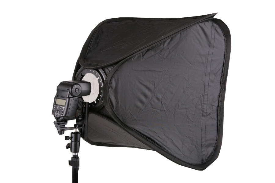 Blesk se upevní do nastavitelných sáněk v držáku na zadní straně softboxu a namíří se do připraveného vstupního otvoru. Nyní můžete fotografovat bez narušení E-TTL II nebo iTTL měření. Světlo je rozptylováno přes dvojitou difuzní látku zajišťující dostatečně měkké a rovnoměrně rozptýlené světlo na fotografovaném objektu. Softbox lze upevnit na světelný stativ (5/8“ čep).