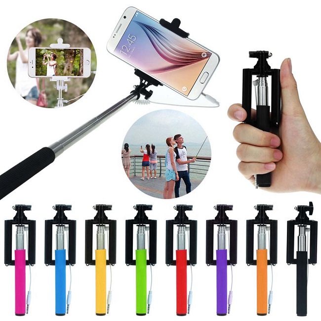 Selfie tyč s držákem telefonu a odpalovacím kabelem.