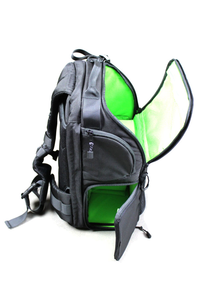 Vnitřek batohu je polstrovaný transparentně zeleným polstrovaným materiálem.