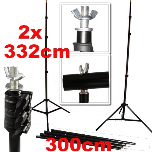 Max. výška stativu 332cm - při této výšce stativy stále stabilně stojí, nohy stativu jsou staženy co nejvíce k sobě, konstrukce po zavěšení pozadí nemusí být až tak stabilní.