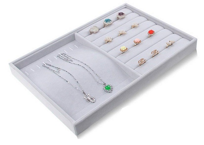 Polovina plata vhodná pro uchycení náhrdelníků, druhá polovina vhodná pro prstýnky.