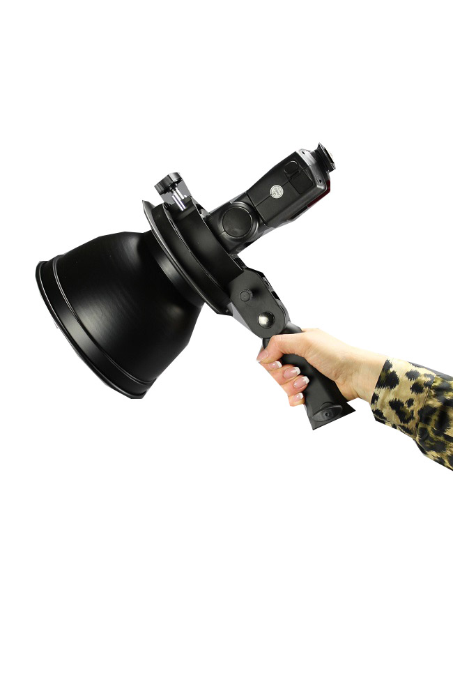 Držák se může používat jak na stativu tak v ruce k čemuž slouží propracovaná mohutná rukojeť.